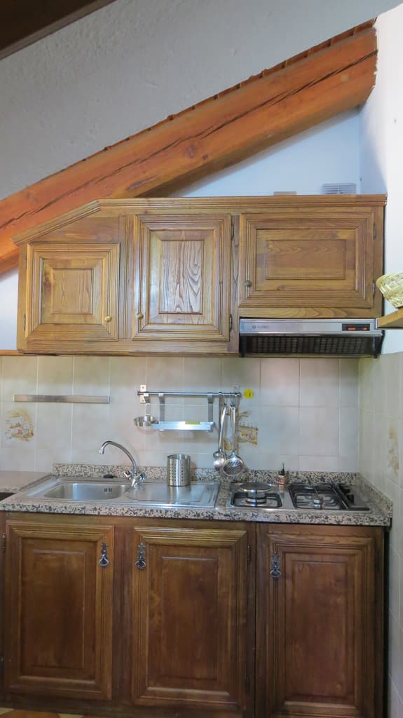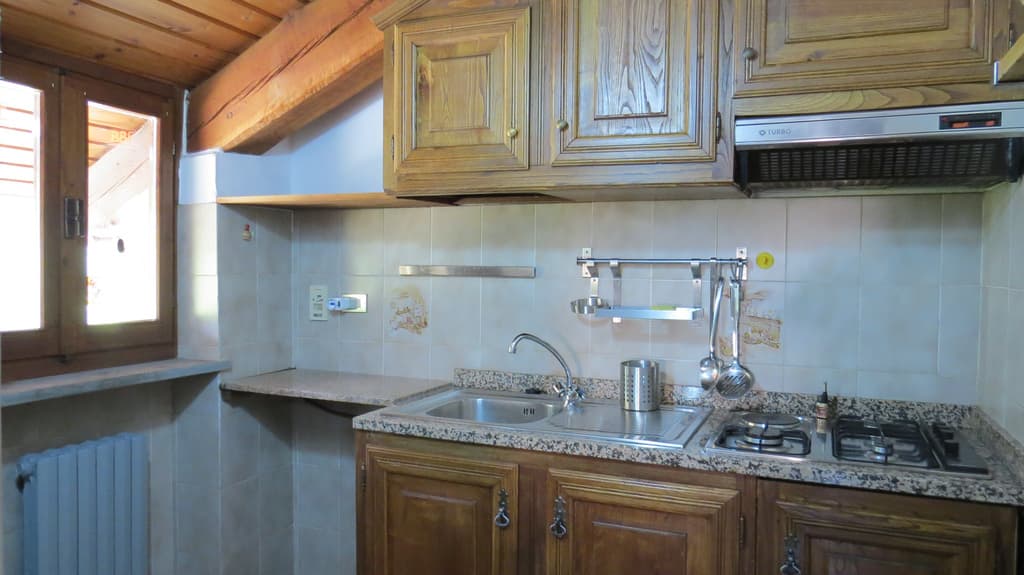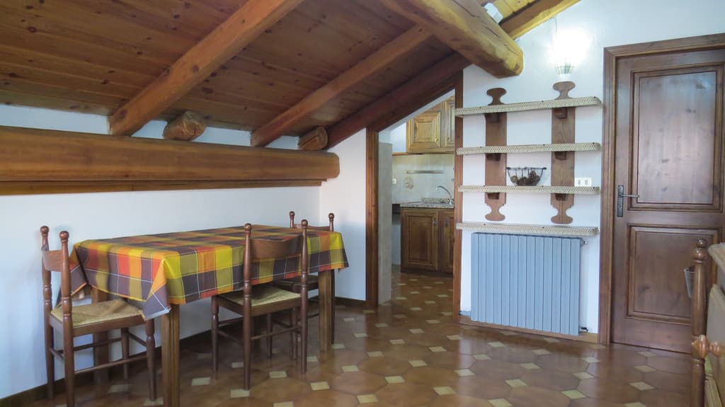 Ampio bilocale mansardato composto da: ingresso su soggiorno, cucinotto, camera matrimoniale e servizio. Dalla zona giorno si ha l'accesso al balcone. Al piano terra una cantinetta. Il riscaldamento è completamente autonomo gestito da una caldaietta a gas. L'alloggio è predisposto con quattro posti letto ed è disponibile per la stagione invernale.