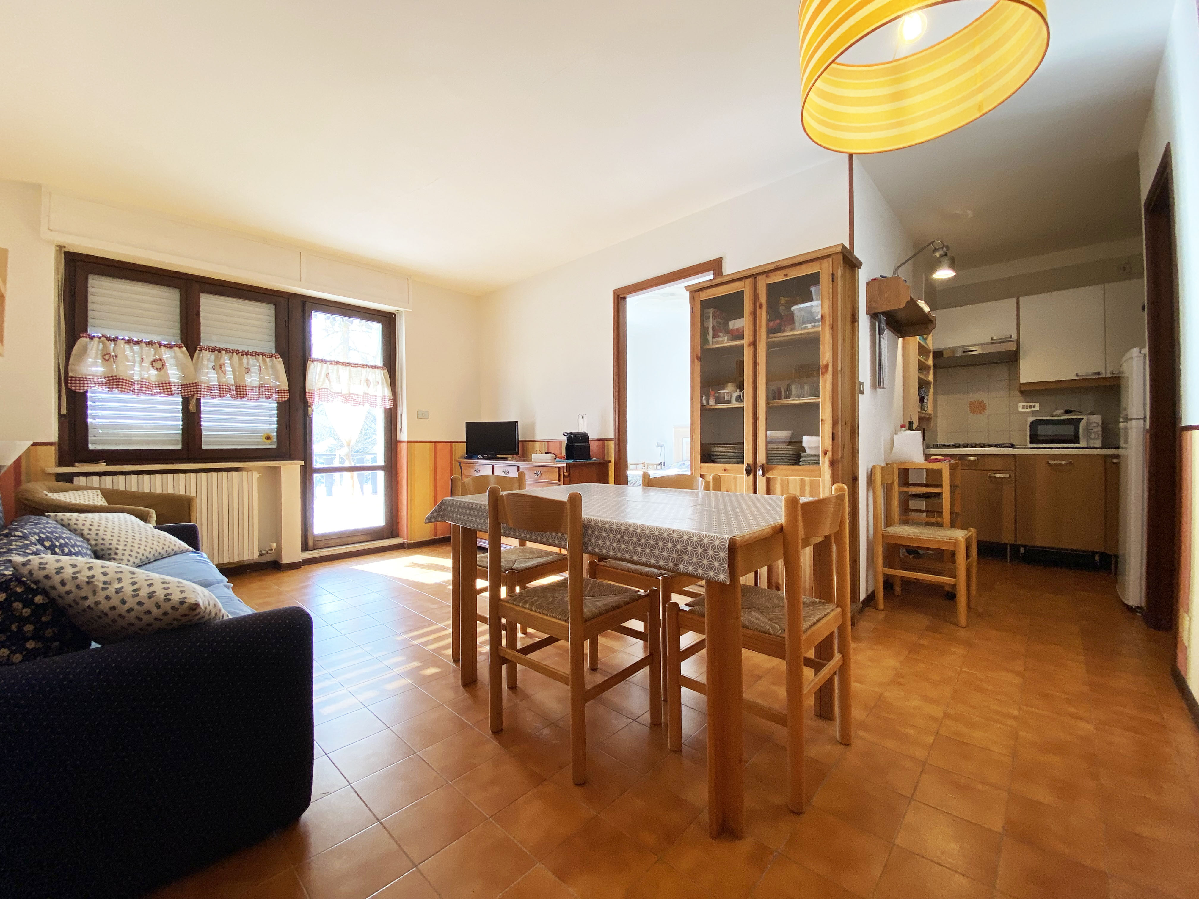 In zona centrale, comodo a tutti i servizi, alloggio di ingresso, soggiorno, cucinotto, camera matrimoniale, cameretta e servizio. Dal soggiorno si accede all'ampio e soleggiato terrazzo esposto a sud. Nell'autorimessa un box auto. Attrezzato per sei persone e disponibile solo per la locazione annuale.