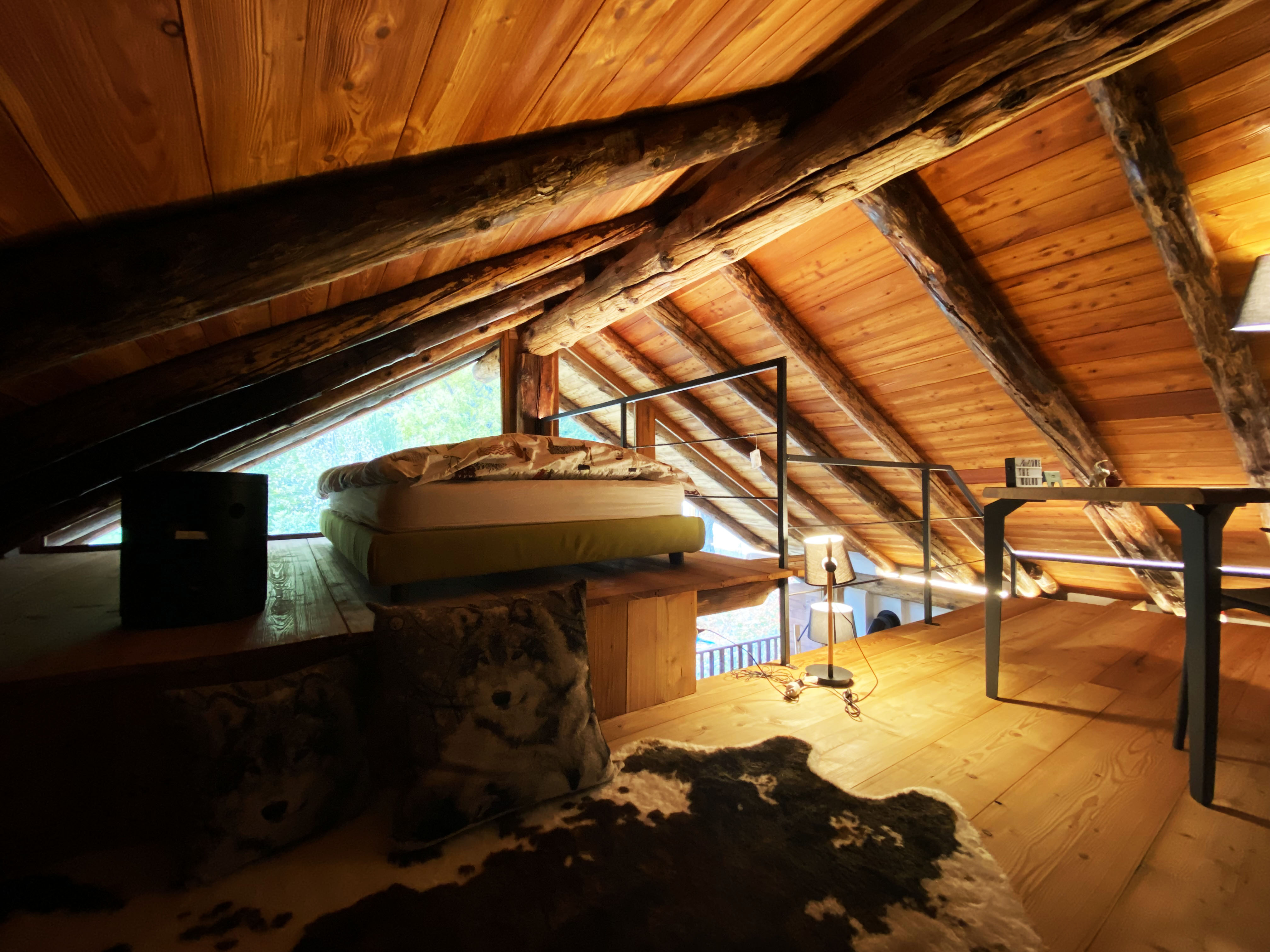Una scala di legno conduce ad un ampio soppalco affacciato sul soggiorno, uno spazio versatile che può essere utilizzato come seconda camera, studio o semplicemente una zona dove rilassarsi.